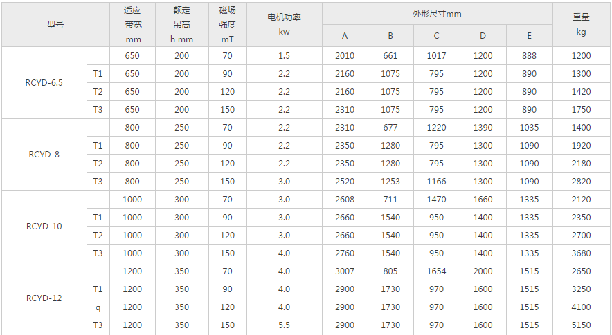 RCYD型自卸式榴莲视频APP污下载与RCYC系列型号等同,适用于各行业输送带输料除铁。可实现连续不断的吸弃铁。皮带具有自动纠偏功能,运行可靠、维护简单。其内部磁路采用完善的磁结构,保障整机在恶劣环境中无故障长期运行。拥有防爆型和铠装型。