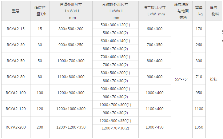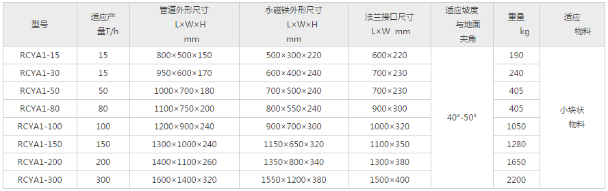RCYA型倾斜管道式永磁榴莲视频APP污下载分为RCYAl、RCYA2两种,包括无磁管道和永磁铁两部分,专用于封闭管道内非磁性物料的除铁,永磁除铁器内部采用高性能强磁材料组成复合磁系。具有体积小、磁力大、重量轻、除铁干净、方便、低能耗、使用寿命长等特点。